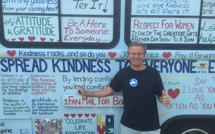 Bob Votruba’s home is a converted transit bus, the second he’s gone through over the past eight years. Saddened by the tragic Virginia Tech shootings of 2007, Bob searched for a response to that unspeakable hate. His answer lay at the other end of the spectrum, looking for opportunities to spread acts of kindness wherever he could. At that rare intersection in life where time, opportunity and passion meet, Bob sold everything, bought a beat-up school bus, and hit the road to dedicate his life to this cause. He gathered family and friends to emblazon his new ride with uplifting quotes and set out to spread the message to all who’d listen.