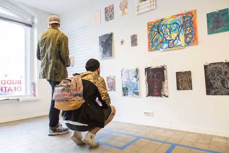Moyovo umění visící na stěnách v „Buddhas On Death Row“. Foto přes Maria Jain.