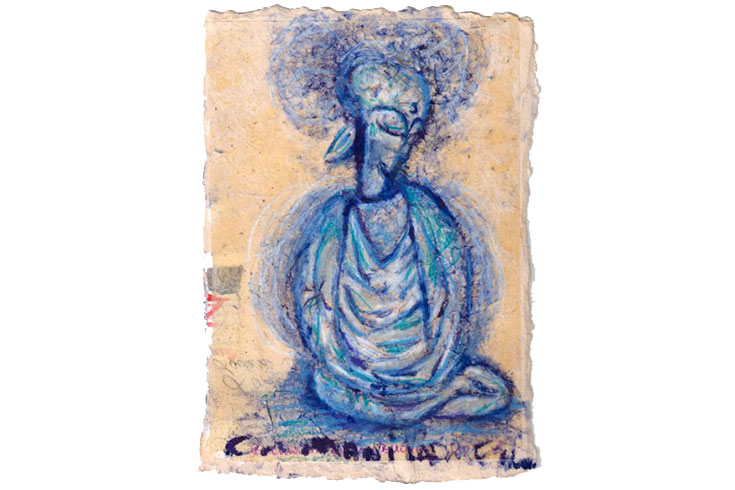 Yogini od Moyo, 2015. Barevná tužka na yupo. Toto je první kus darovaný Jain od Moyo, který inspiroval nápad na výstavu.