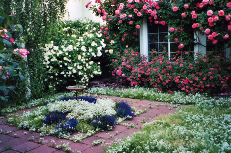 That cosmic dot in the courtyard has now been surrounded by a Mystic Spiral of lobelias and white alyssum. Lobelias, let’s not forget, were brought to the northern hemisphere from the southernmost tip of the African continent and named after Mathias de l’Obel, physician to England’s James I.