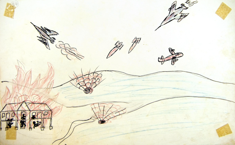But I don’t believe that children in all countries and conflicts represent their experiences in the same way. The drawings of children imprisoned in Nazi concentration camps during World War II are not formally or symbolically interchangeable with drawings made by children exposed to America’s bombing campaign in Laos. Nor can these be interpreted in the same way as images produced by Ukrainian, Yemeni, Syrian or Sudanese children today.