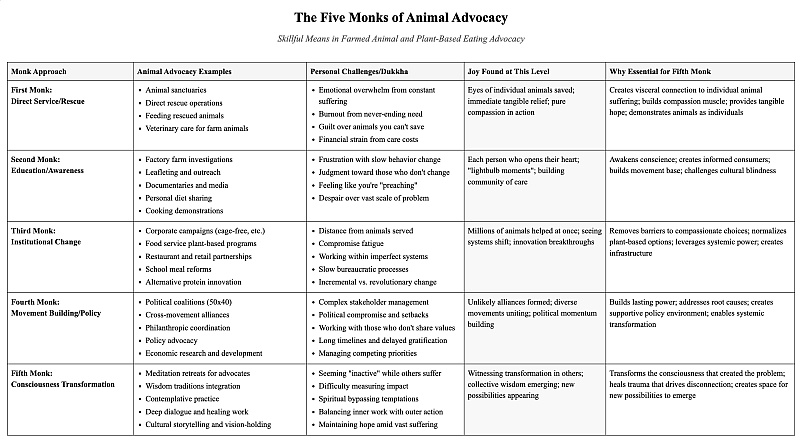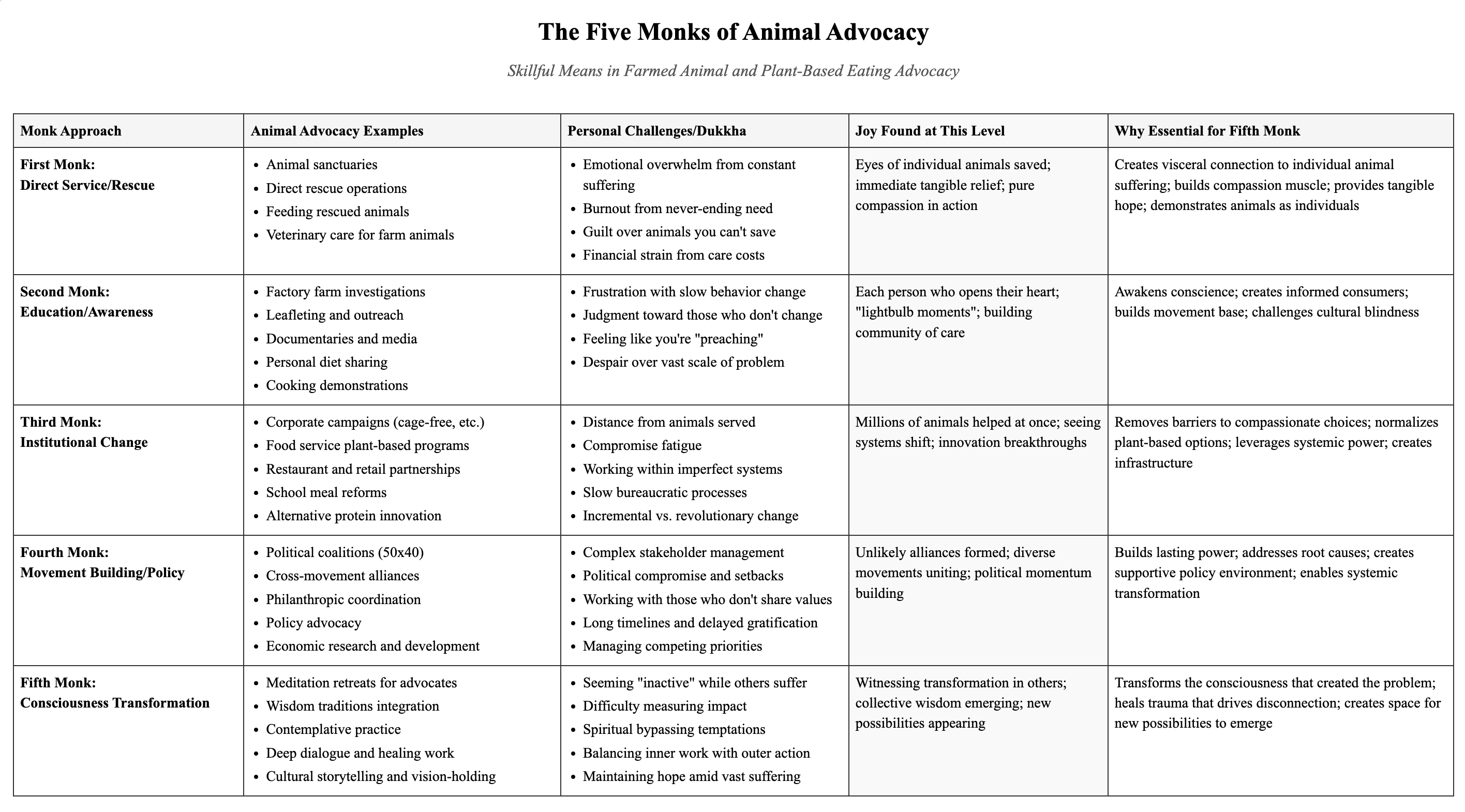 But then, nine years ago, something shifted. We started hosting weekly meditation at my house. A year later, we began hosting meditation retreats for animal advocates (with a real monk!). This was my introduction to Fifth Monk work - not replacing the other approaches, but creating the conditions where they could emerge from wisdom rather than reactive urgency.