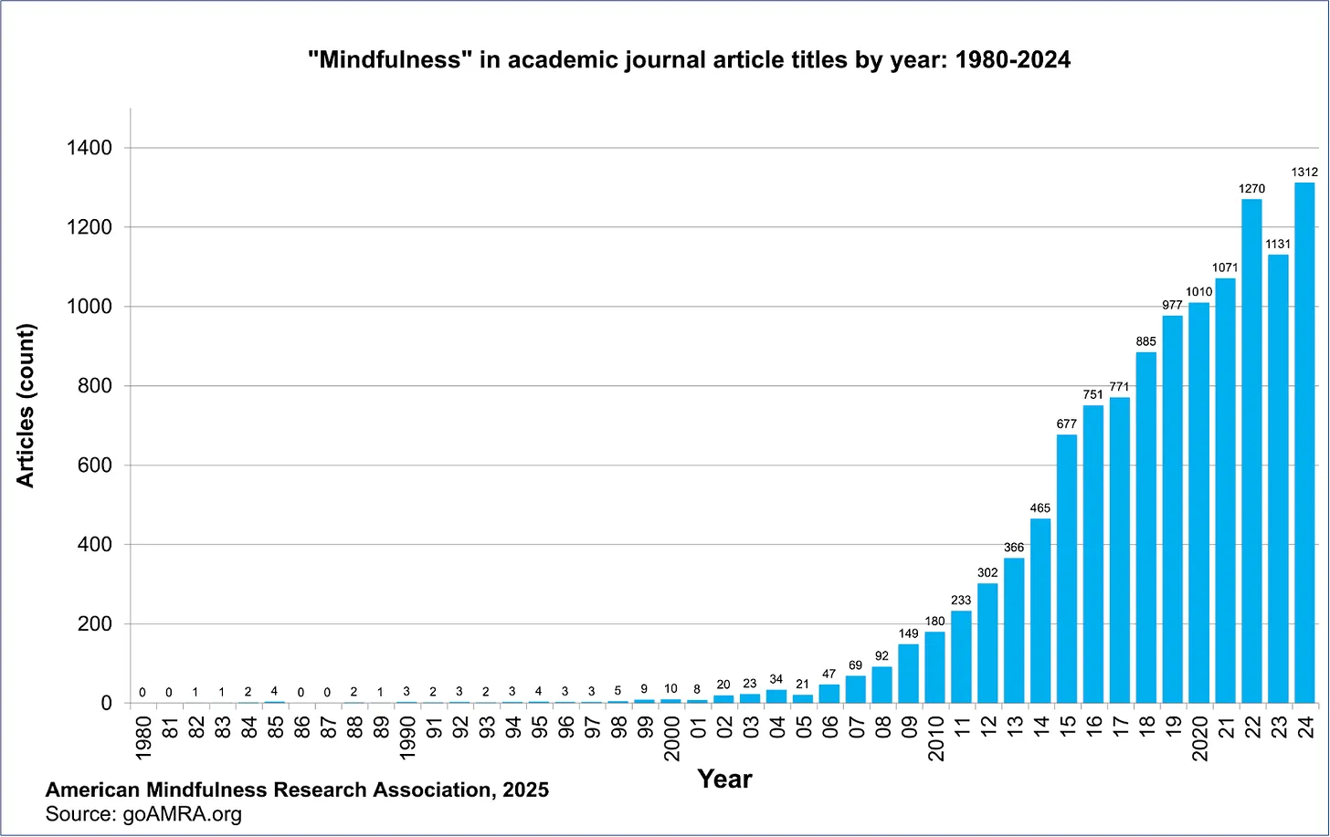 That ignition looks like tens of thousands of peer-reviewed papers with mindfulness in the title, abstract, or keywords by 2024.